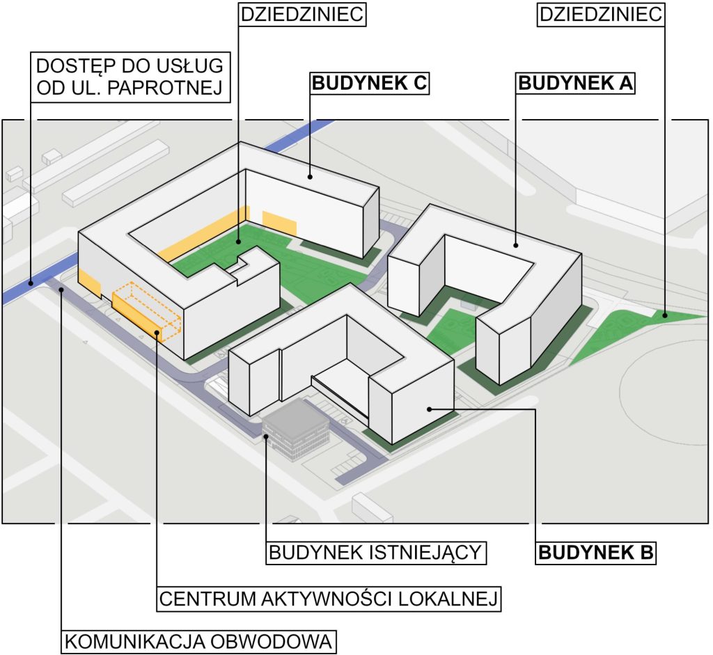 Najbiżej pętli tramwajowej „Poświętne” planowany jest budynek Budynek A sąsiadujący z nowym parkiem kieszonkowym. Bliżej zajezdni autobusowej zaprojektowano Budynek B natomiast bezpośrednio od ulicy Paprotnej zlokalizowany zostanie Budynek C, w którym proponujemy zlokalizowanie Centrum Aktywności Lokalnej.